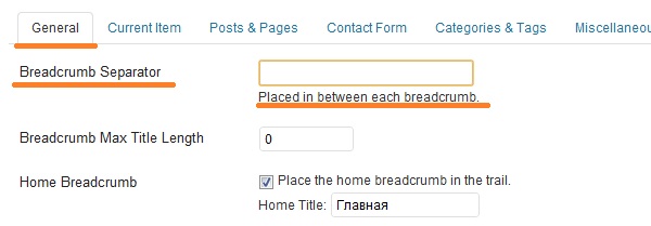 Настройки плагина находятся в параметрах. Во вкладке General нужно найти строчку Breadcrumb Separator и удалить стандартное значение, которое там стоит, другими словами, нужно оставить поле пустым.