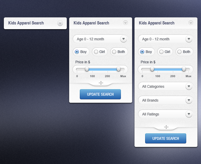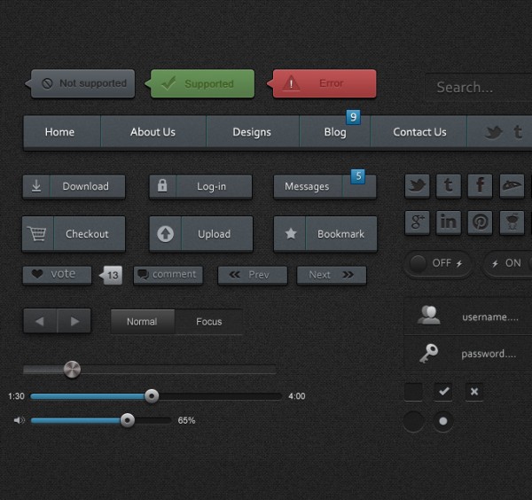 Бесплатные PSD исходники форм поиска и входа, музыкальных плееров, кнопок и ещё нескольких классных элементов