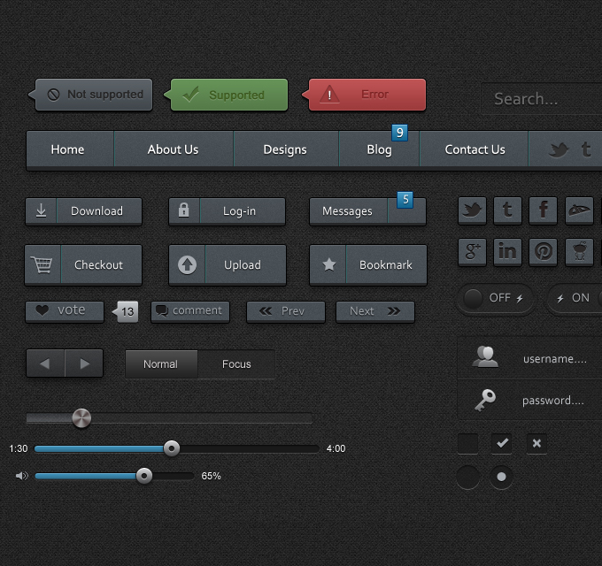 Приветствую Вас, дорогие читатели блога. Сегодня очень хочется поделиться с Вами очередной подборкой качественных PSD исходником разных элементов веб дизайна. Что именно войдёт в эту подборку? Это плееры музыкальные, несколько красивых кнопок, а так же формы поиска и входа на сайт. Но и это ещё не весь список, самое вкусное Вас ждёт ниже :-)