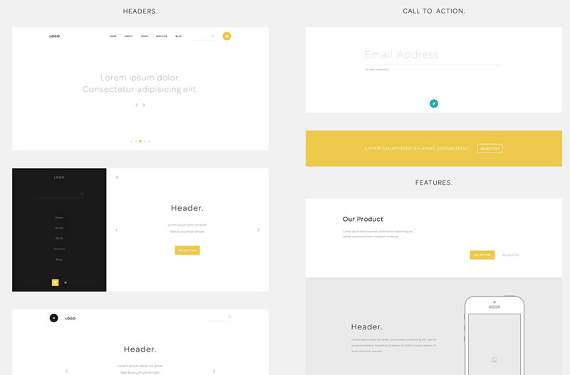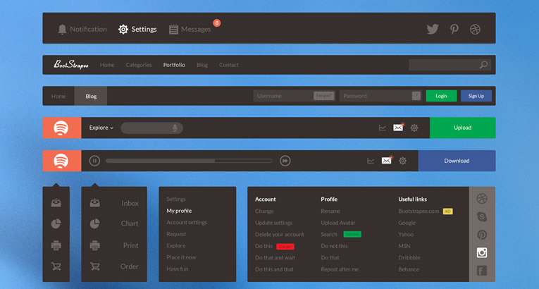 Все компоненты и наборы, которые представлены внизу сделаны по последним и современным стандартам, так же все архивы по полной укомплектованы. тут Вы найдёте, множество кнопок, иконок, форм, разнообразных виджетов, меню, навигации и ещё очень много нужных элементов.