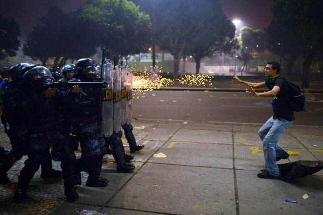 Бразильский протестующий стоит перед стреляющими стражами порядка