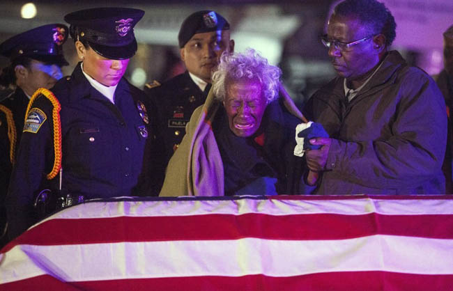 Жена павшего американского солдата, спит возле его гроба перед погребением