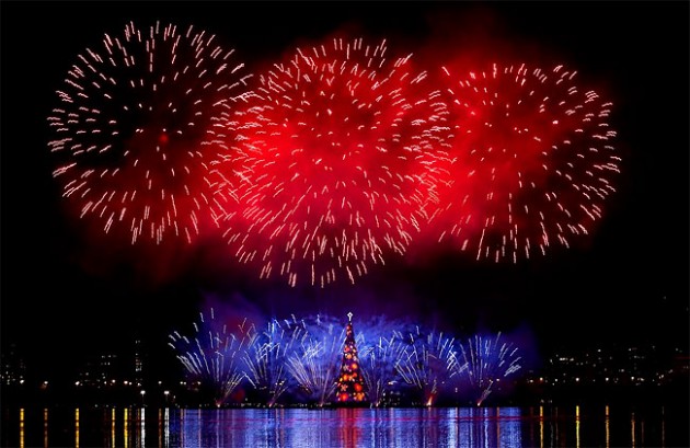 Вот так вот громко отмечают приход Нового года в Рио-де-Жанейро, Бразилия. Огромная ёлка с множеством разноцветных огней. И это всё сопровождается чудесным салютом. Елка, кстати, считается одной из самых больших в мире. Но выглядит маленькой на фоне салюта :-)
