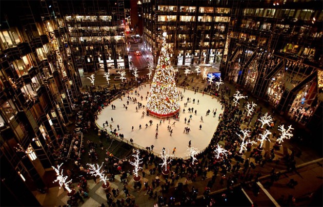 Очень удачным решением было поставить Новогоднюю ёлку по центру котка на коньках. По моему очень романтично и красиво :-) На фото центр города Питтсбург.