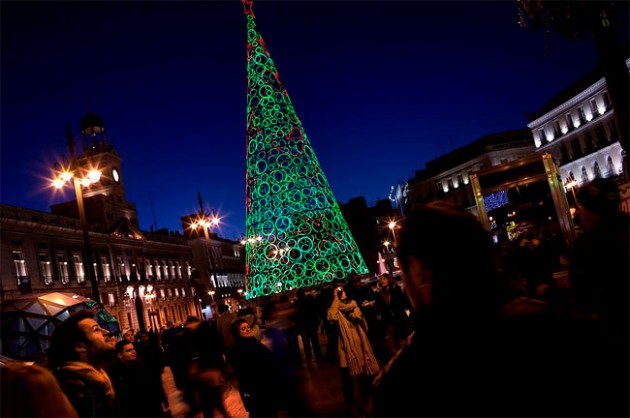 Необычное дизайнерское решение, сделать красивую ёлку с разноцветными горящими кругами. Это чудо находится в Мадриде. Но всё же красивее смотрится чем зелёные квадраты :-)
