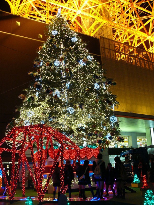 Гигантская ёлка, которая стоит ниже Токийской башни в Японии.