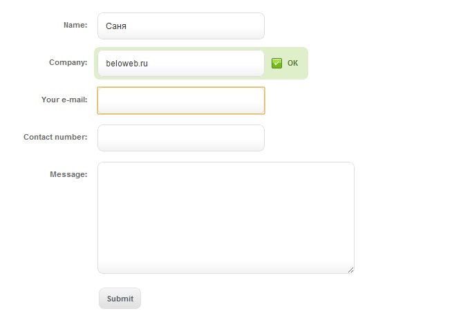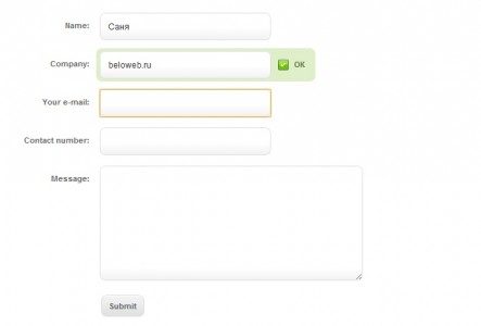 Замечательное оформление формы обратной связи. Особенно понравилась проверка правильности ввода, которая очень быстро осуществляет проверку.