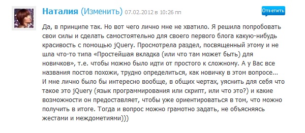 Наталия полностью права, мой блог посвящён, в принципе, JQuery, и JQuery плагинам, но что это такое, и как эти плагины применять на сайтах я не писал ниразу. Дорогие читатели, простите меня :-) я исправлюсь, честно :-)