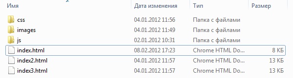 Как видите у меня есть три папки с картинками, стилями и с самим скриптом, а также три примера index.html. В данном случае будем использовать именно его.