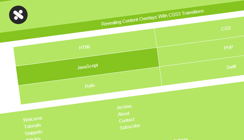 <nav class="cmn-overlays-nav"> <ul class="clearfix"> <li><a href="#html">HTML</a></li> <li><a href="#css">CSS</a></li> <li><a href="#js">JavaScript</a></li> <li><a href="#php">PHP</a></li> <li><a href="#rails">Rails</a></li> <li><a href="#swift">Swift</a></li> </ul> </nav><!-- /nav.cmn-overlays-nav --> <section id="html"> <div class="content"> <article> <h2>HTML</h2> </article> <a href="#" class="close">x</a> </div><!-- /.content --> </section><!-- /section#html --> <section id="css"> <div class="content"> ... </div><!-- /.content --> </section><!-- /section#css --> <section id="js"> <div class="content"> ... </div><!-- /.content --> </section><!-- /section#js --> <section id="php"> <div class="content"> ... </div><!-- /.content --> </section><!-- /section#php --> <section id="rails"> <div class="content"> ... </div><!-- /.content --> </section><!-- /section#rails --> <section id="swift"> <div class="content"> ... </div><!-- /.content --> </section><!-- /section#swift -->