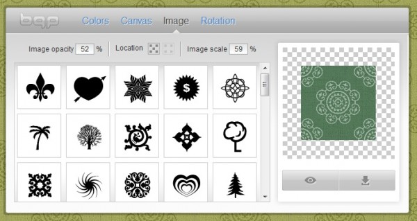 Замечательный генератор паттернов. Есть много настроек, а также есть несколько изображений, которые Вы сможете использовать. Чтобы убрать изображение, прозрачность нужно поставить на 0.