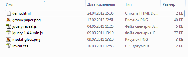 Как видите в исходниках у нас есть файл demo.html который Вы можете открыть и сразу же посмотреть пример всплывающих окон на компьютере. Так же присутствует скрипт самих окон jquery.reveal.js, затем jquery-1.4.4.min.js — это фреймворк jquery, если он у Вас уже прикручен, его можно удалить. И конечно же стили модальных окон reveal.css.