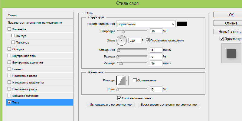 Вот, почти всё готово, но мне кажется что (по вкусу) можно добавить немного тени для буквы. Для этого выбираем слой с буквой, кликаем по нему 2 раза, и выбираем «Тень», выставляем такие параметры: