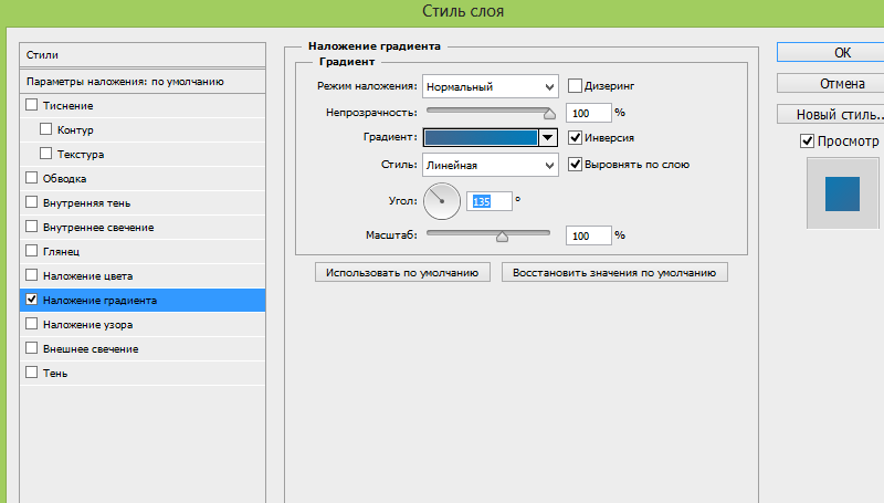 Теперь щёлкаем по слою с фоном два раза. Выбираем «наложение градиента» и выставляем следующие значения: