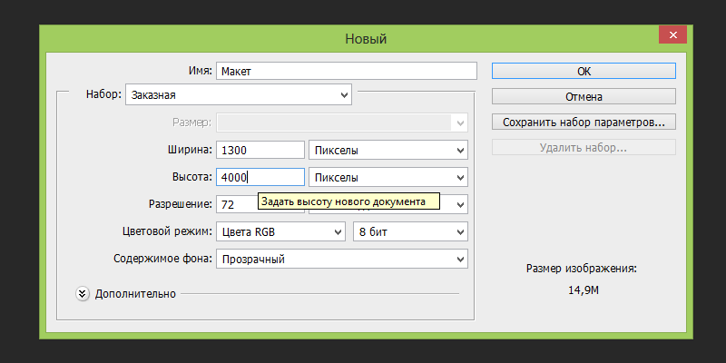 В моём случае сайт будет иметь ширину в 1200рх. Таким образом я сделал документ шириной в 1300 рх и высотой в 4000 рх. Остальные настройки оставьте как есть.