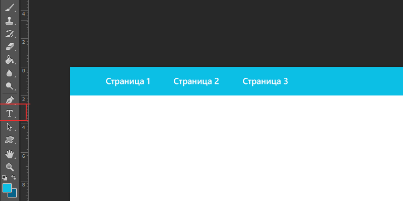 Кликаем на инструмент «Горизонтальный текст». Сверху в панели выбираем шрифт «Segoe UI». Теперь кликаем на голубом фоне меню и пишем название наших страниц. Потом Вы можете переместить текст куда Вам нужно.