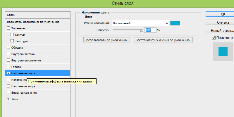 По слою с фигурой нажимаем два раза мышкой, откроется окно со стилем слоя. Ставим галочки на против «Наложение цвета» И вбиваем туда вот этот цвет #0aaacc.