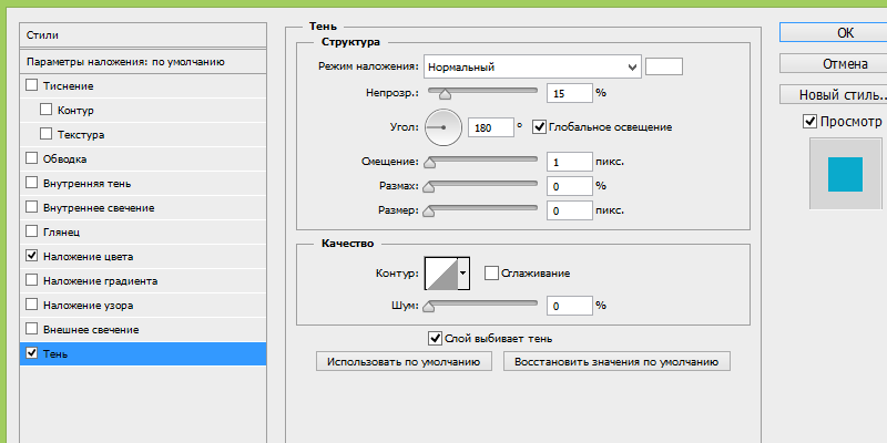 Переходим в пункт «Тень» и задаём следующие параметры: