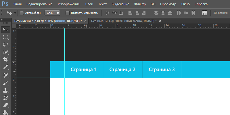 Теперь создаём разделители между страницами. И сделаем им небольшой эффект вдавленности. Создаём новый слой, выбираем инструмент «Линия». Затем зажимаем Shift и рисуем вертикальную линию через весь голубой фон нашего меню.