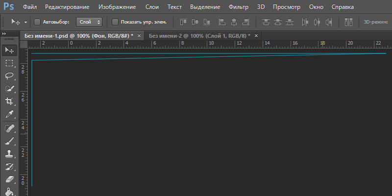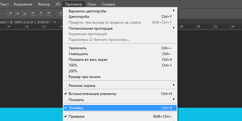 Теперь нам нужно выставить размер будущего сайта, чтобы он выглядел так же как будет смотреться в браузере. Делать мы будем это с помощью линейки. Если она у Вас не активна, нужно зайти в «Просмотр» и поставить галочку на против «Линейка». Затем она должна появиться у Вас в окне просмотра.