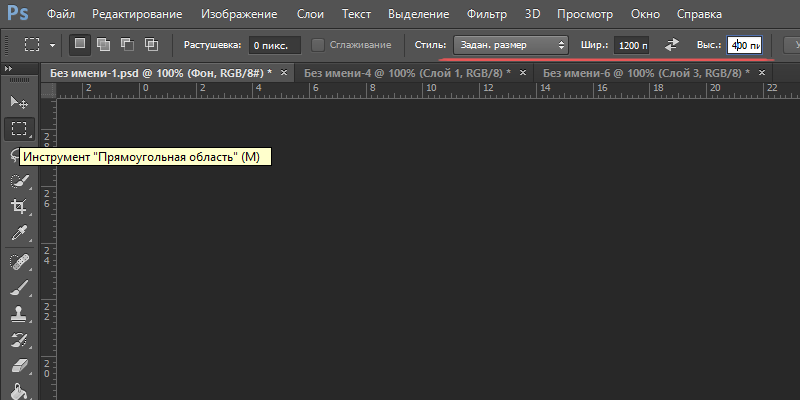 После того как мы нашли центр, нужно поместить наш сайт шириной в 1200 рх в центр документа который имеет размер в 1300 рх. Для этого выбираем инструмент «Прямоугольная область», сверху устанавливаем Стиль на Заданный размер, куда пишем вот такие значения: ширина — 1200рх, высота 400рх. Далее просто кликаем по нашему белому фону и у нас появится выделенная область той ширины которая нам нужна.