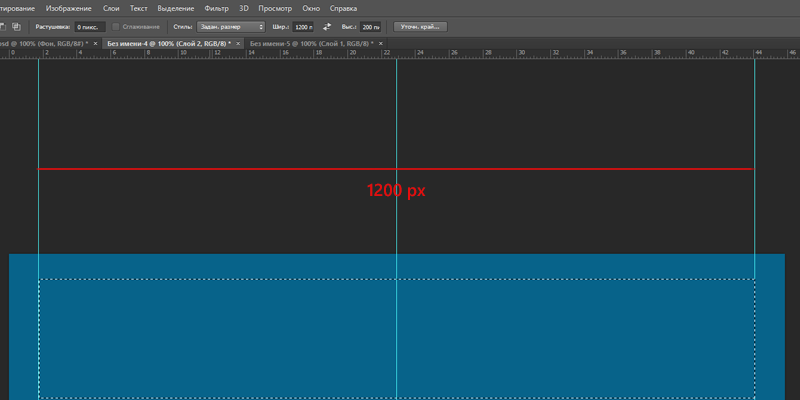 Теперь нашу выделенную область помещаем с помощью мышки по центру, она найдёт центр сама. Затем нужно вытащить ещё 2 линейки и установить их по обе стороны выделенной области. Таким образом мы обозначаем границы нашего будущего сайта, который будет иметь ширину в 1200 рх. Так же по этим линейка будет проще подгонять элементы дизайна. Если Вам не понятно сделайте так же как на рисунке ниже.
