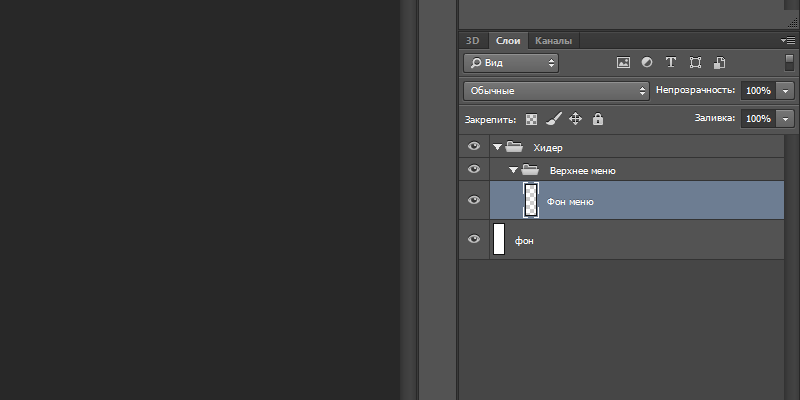 Создаём группу, и называем её «Хидер» (Шапка) в ней же создаём под группу «Верхнее меню» так как будем начинать именно с него. В группе создаём новый слой и называем его «фон». Это будет фон нашего верхнего меню.