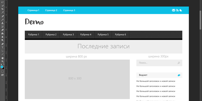 Как видите, что шаблон получился не сложный, естественно это блоговый шаблон, который позже мы будем верстать в HTML. Ну а пока что только будем рисовать. Ну а теперь поехали.