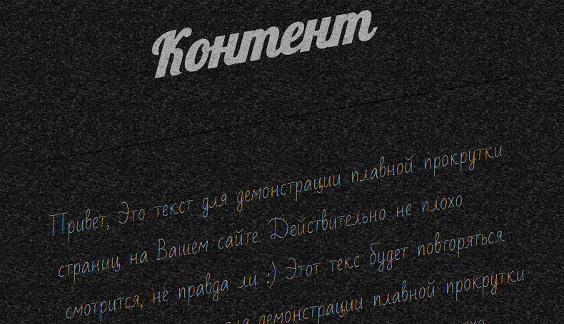 Привет, Это текст для демонстрации плавной прокрутки страниц на Вашем сайте. Действительно не плохо смотрится, не правда ли :) Этот текс будет повторяться.