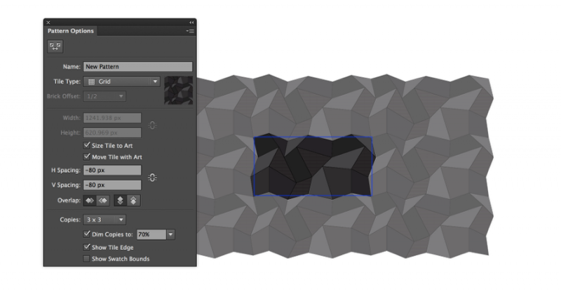 Выделите область, которую хотите создать и далее перейдите в Object затем Expand. После этого следует перейти Object — Pattern — Make. Выберите Size Tile to Art and Move Tile with Art. После этого измените интервалы H и V пока не останется места плитами:
