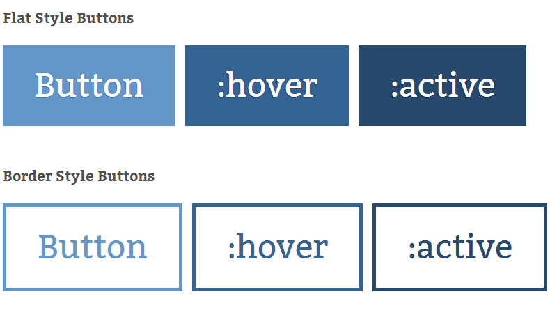 <section class="flat"> <button>Button</button> <button class="hover">:hover</button> <button class="active">:active</button> </section> <section class="border"> <button>Button</button> <button class="hover">:hover</button> <button class="active">:active</button> </section> <section class="gradient"> <button>Button</button> <button class="hover">:hover</button> <button class="active">:active</button> </section> <section class="press"> <button>Button</button> <button class="hover">:hover</button> <button class="active">:active</button> </section>