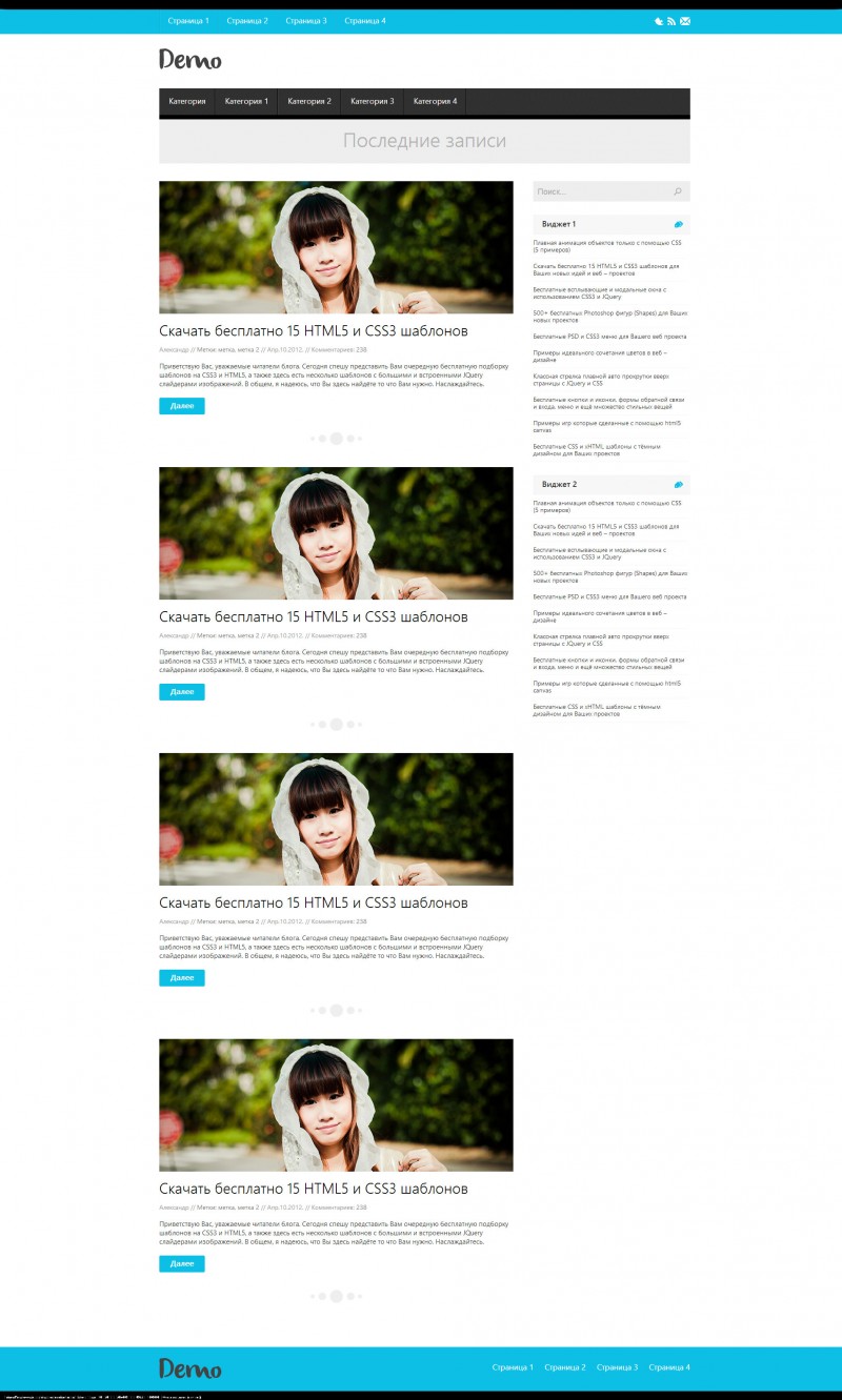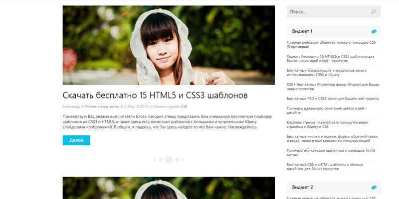 <!-- Начало .postBox --> <article class="postBox"> <div class="postThumb"><a href="#"><img width="800" height="300" src="images/tumb.png"/></a></div> <h2><a href="#">Скачать бесплатно 15 HTML5 и CSS3 шаблонов</a></h2> <div class="info"> Александр // <a href="#">Метки: метка, метка 2</a> // Апр.10.2012. // Комментариев: <a href="#">238</a> </div> <div class="textPreview"> <p>Приветствую Вас, уважаемые читатели блога. Сегодня спешу представить Вам очередную бесплатную подборку шаблонов на CSS3 и HTML5, а также здесь есть несколько шаблонов с большими и встроенными JQuery слайдерами изображений. В общем, я надеюсь, что Вы здесь найдёте то что Вам нужно. Наслаждайтесь.</p> </div> <div class="more-link"><a href="#">Далее</a></div> </article> <!-- Конец .postBox --> <div class="raz"></div>