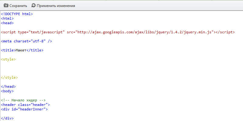 <!DOCTYPE html> <html> <head> <script type="text/javascript" src="http://ajax.googleapis.com/ajax/libs/jquery/1.4.2/jquery.min.js"></script> <meta charset="utf-8" /> <title>Макет</title> </head> <body> <!-- Начало хидер --> <header class="header"> <div id="headerInner"> </div> </header><!-- Конец хидер --> <!-- начало врапер --> <section id="wrapper"> <div id="middle"> <div id="content"> <div id="colLeft"> </div><!-- Конец коллефт --> <aside id="colRight"> </aside><!-- Конец колрайт --> </div><!-- Конец контент --> </div><!-- Конец мидл --> </section><!-- Конец врапер --> <!-- Начало футер --> <footer id="footer"> <div id="footerInner"> </div><!-- Конец футериннер --> </footer><!-- Конец футер --> </body> </html>