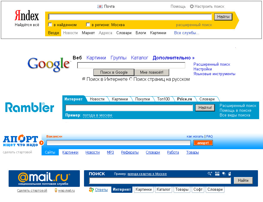 Остальные 11% поделили между собой такие поисковые машины как: Aport, Mail.ru, Yahoo, KM.ru.
