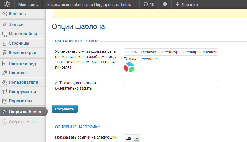 После того как только Вы активируете шаблон, в админке у Вас появится страница с настройками, в которой Вы сможете задать самые необходимые функции, например такие как задать логотип и т. д.