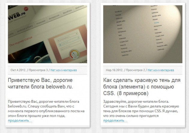 Как видите, что блоки для предсмотра статей на главной расположены в два ряда. Таким образом пользователь видит сразу две статьи. На мой взгляд очень удобно и функционально.