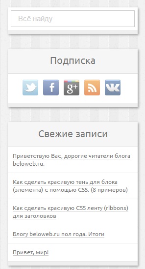 Сайдбар стандартный, тоже в виде блоков. В самом начале по умолчанию стоит поиск и подписка. Для подписки нужно поставить свои ссылки в sidebar.php: