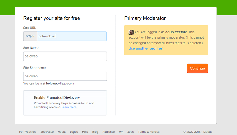 В поле Site URL введите адрес своего сайта, в остальных полях введите название сайта, и короткое название сайта, можете сделать как у меня на скриншоте. Теперь нажмите кнопку Continue.