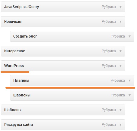 Теперь нужно создать подрубрики. В данном случае у рубрики WordPress будет подрубрика Плагины. Для этого Плагины нужно перетащить чуть правее. Смотрите на рисунке ниже, что у меня получилось.