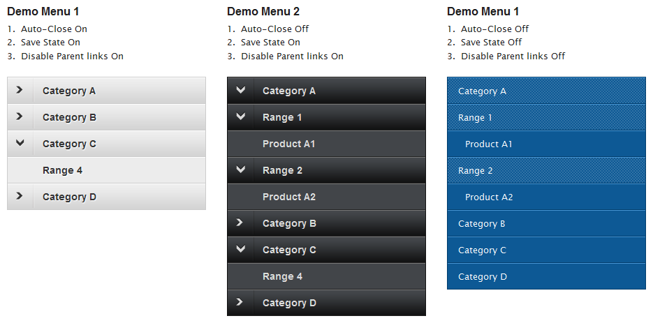 Плагин JQuery Accordion Menu Widget легок в установке и в использовании, к тому же очень функционален. В нем присутствует несколько тем оформления, цветов самого меню, а именно красное, синее, чёрное и серое. Соответственно это аккордеон меню вольётся практически в любой дизайн блога.