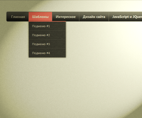 <!-- Начало #dropdown_nav --> <ul id="dropdown_nav"> <li><a class="first" href="#">Главная</a></li> <li><a href="#">Шаблоны</a> <ul class="sub_nav"> <li><a href="#">Подменю #1</a></li> <li><a href="#">Подменю #2</a></li> <li><a href="#">Подменю #3</a></li> <li><a href="#">Подменю #4</a></li> </ul> </li> <li><a href="#">Интересное</a> <ul class="sub_nav"> <li><a href="#">Подменю #1</a></li> <li><a href="#">Подменю #2</a></li> <li><a href="#">Подменю #3</a></li> <li><a href="#">Подменю #4</a></li> </ul> </li> <li><a href="#">Дизайн сайта</a></li> <li><a href="#">JavaScript и JQuery</a></li> <li><a href="#">Новичкам</a></li> <li><a href="#">WordPress</a></li> <li><a class="last" href="#">Новости</a> <ul class="sub_nav"> <li><a href="#">Подменю #1</a></li> <li><a href="#">Подменю #2</a></li> <li><a href="#">Подменю #3</a></li> <li><a href="#">Подменю #4</a></li> </ul> </li> </ul> <!-- конец #dropdown_nav -->