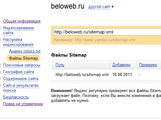 В панели для вебмастеров Яндекса тоже надо зарегистрироваться. Опять же нужно будет добавить мета тег между <head> и </head>. Заходим в Настройка индексирования — Файлы Sitemap. В поле ввода добавляем ссылку на карту сайта.