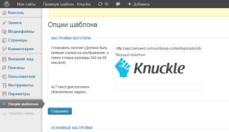 На этой странице Вы сможете сделать самые начальные настройки Вашего шаблона, например, задать ссылки на социальные сети, или же включать и отключать анимацию. А так же сможете задать своё лого, для этого не требуется лезть в код.