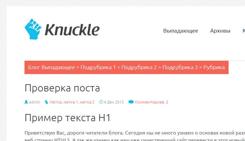 Ну куда же без хлебных крошек? Они существенно облегчают пользование сайтом. С шаблоном Knuckle Вам не придётся устанавливать различные плагины которые отображают заветные ссылки с навигацией. Они уже встроены в тему.