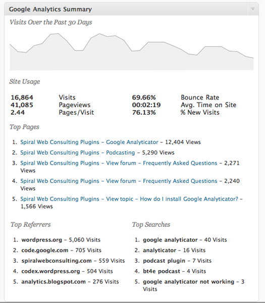Этот плагин вставляет на Ваш блог подробную статистику от Google Analytics. Статистику можно поставить с помощью виджета, или кода.