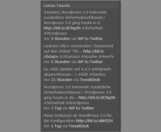 Очень простенький плагин, с помощью которого Вы сможете добавить в свой сайдбар красивый виджет, который будет выводить Ваши записи из Твиттера.